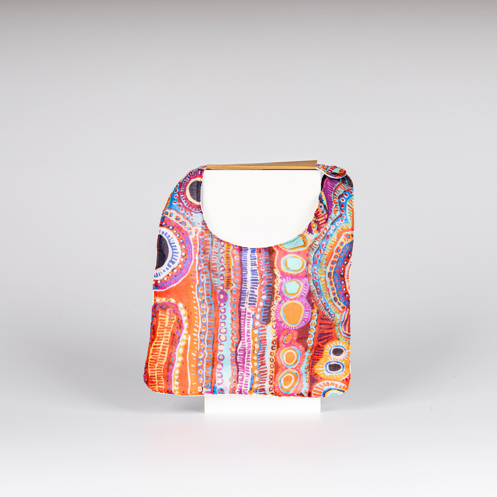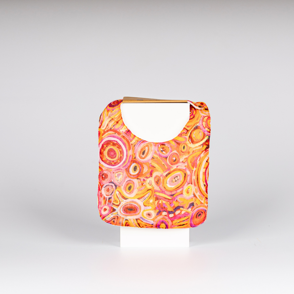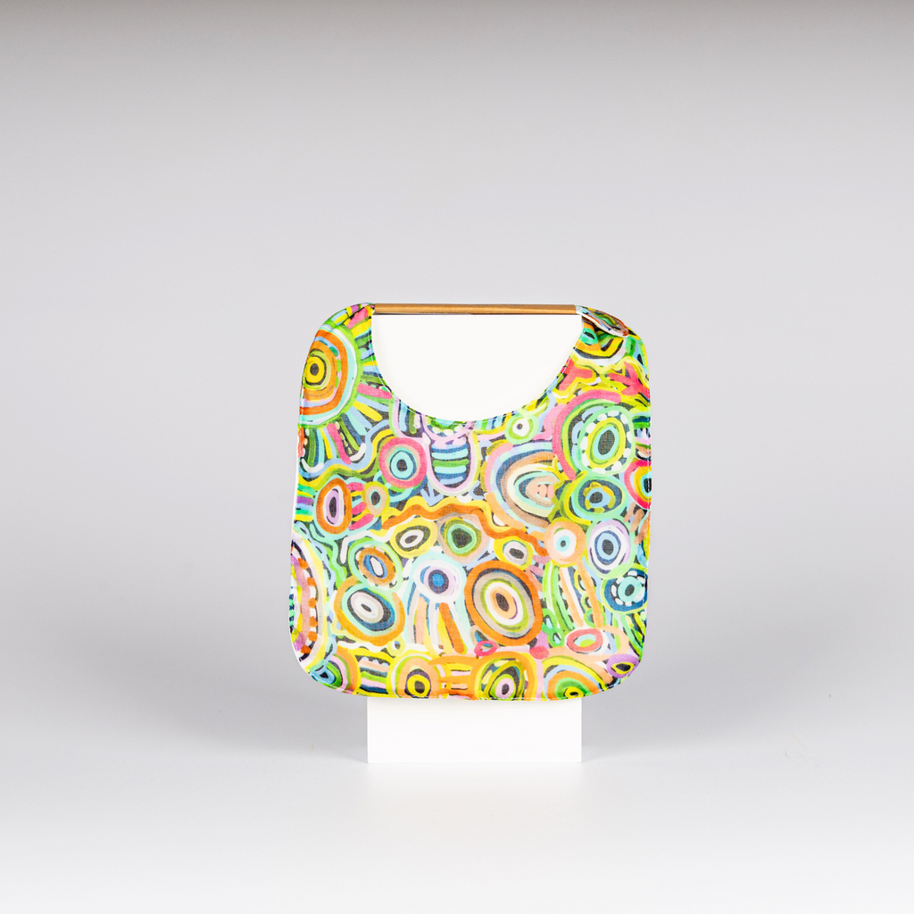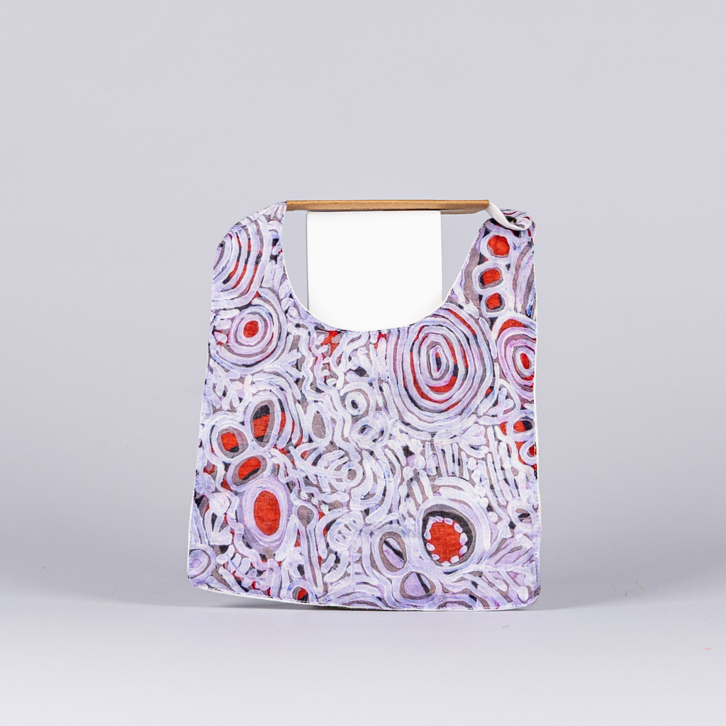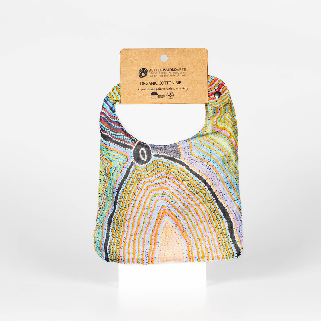 Baby bib featuring artworks by Murdie Nampijinpa Morris and Rama Kaltu Kaltu Sampson.