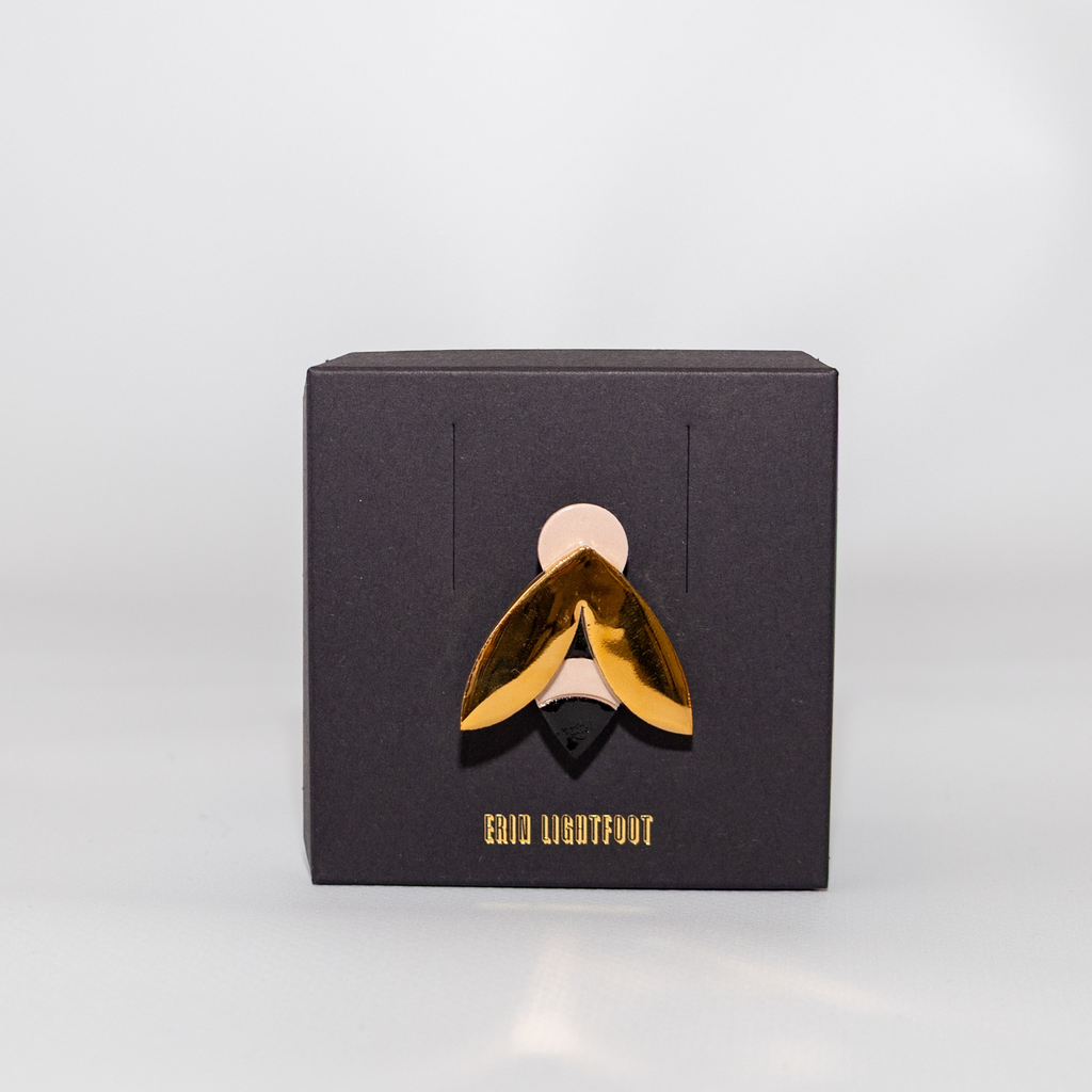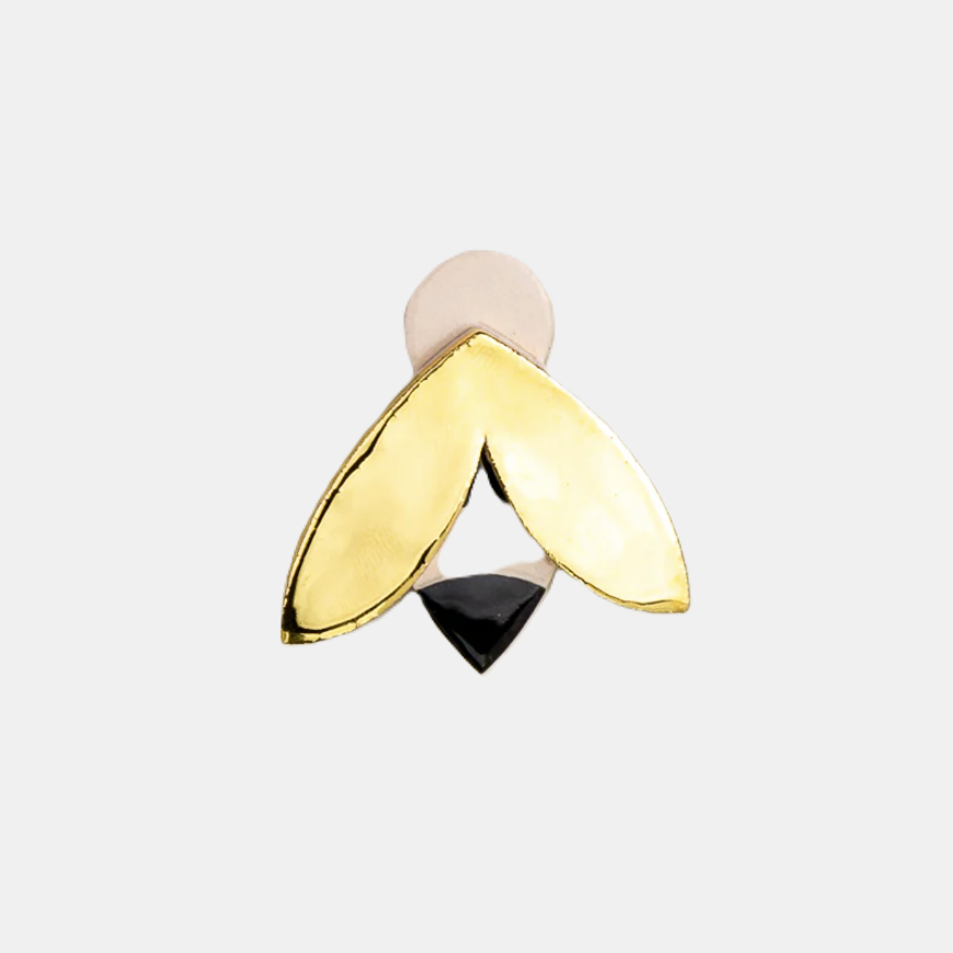 A gorgeous statement piece featuring the stylised form of the bee. Gold gilding reflects warm colours of pollen and honey with gloss black porcelain. Great with a formal jacket, summer shirt or fastening a scarf.