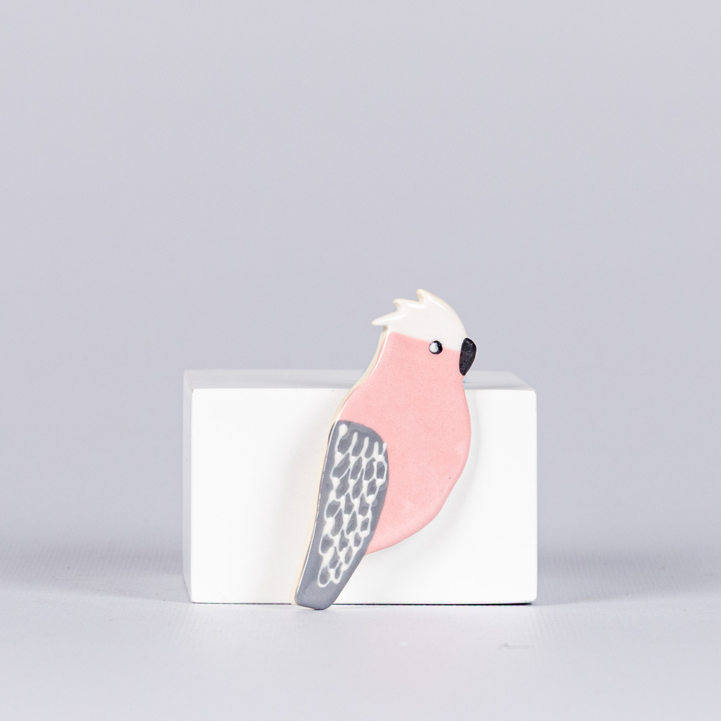 Galah brooch lovingly handmade using cream/white earthenware clay with a gloss glaze on the front.