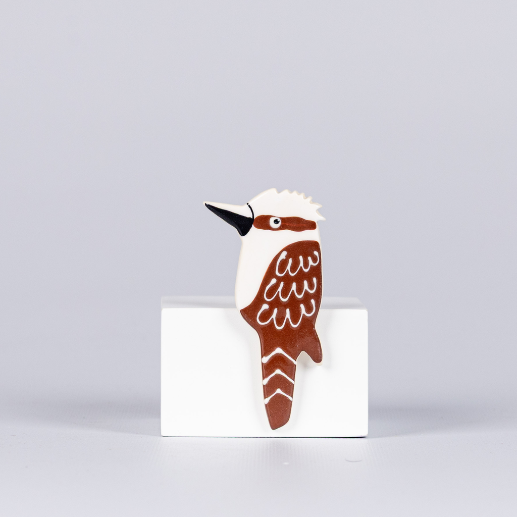 Kookaburra brooch lovingly handmade using cream/white earthenware clay with a gloss glaze on the front.