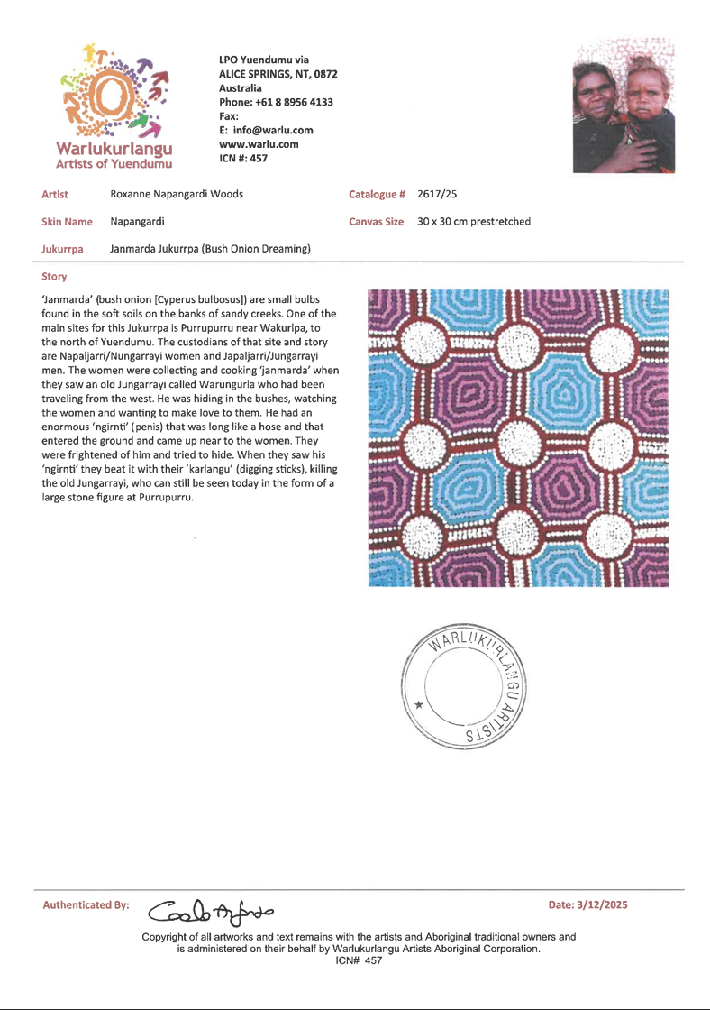 Janmarda Jukurrpa (Bush Onion Dreaming) by Roxanne Napangardi Woods.