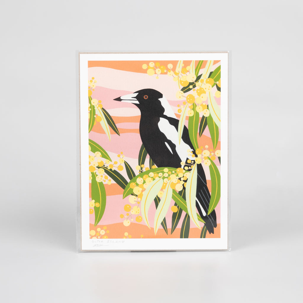 Fine art print featuring an illustration of a a magpie perched amongst wattle.