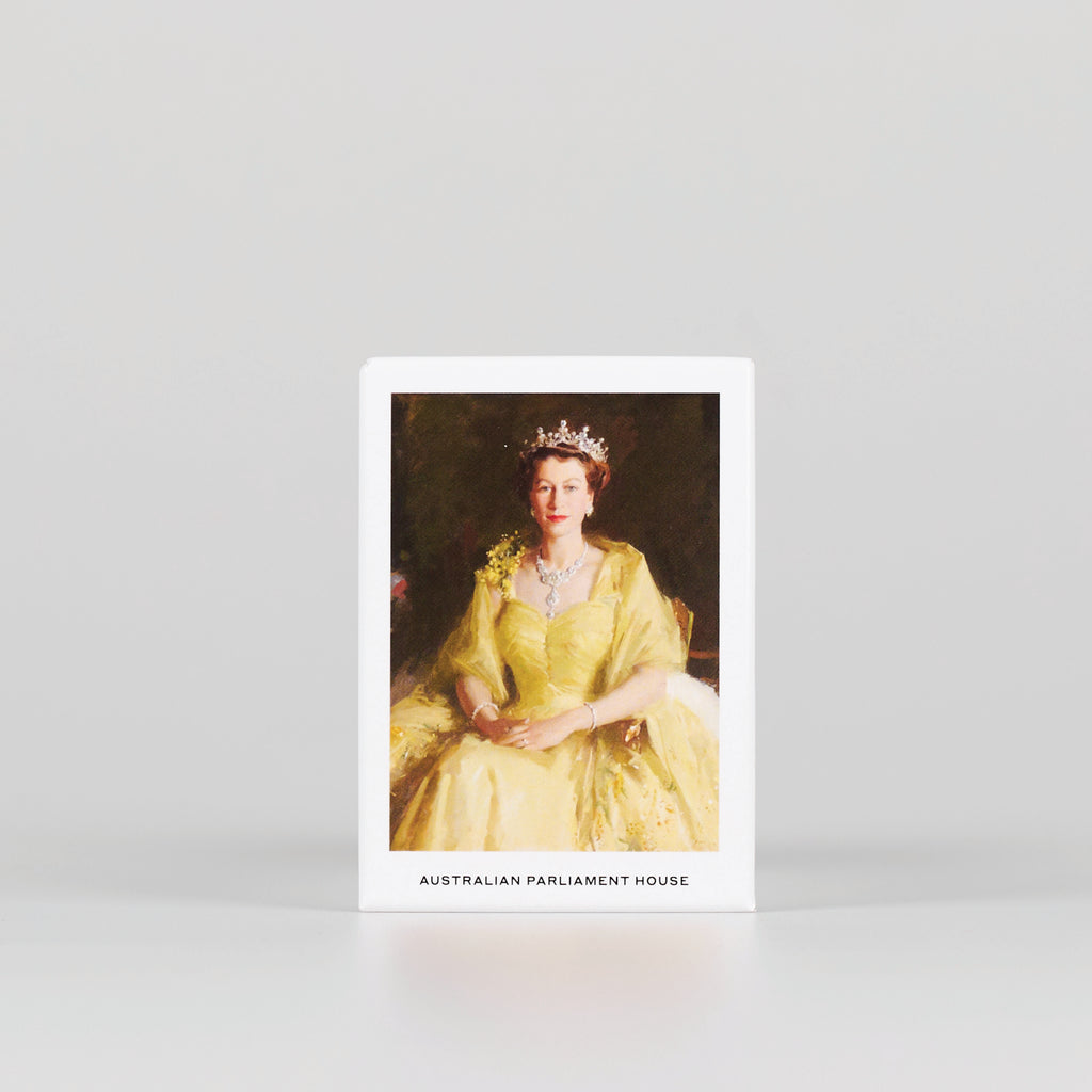 This portrait was painted ‘from life’ over the course of five sittings at Buckingham Palace during November 1954. Considered a national icon the painting is also known as the ‘Wattle Queen’ or the ‘Wattle painting’. These titles refer to Australia‘s national floral emblem the golden wattle (Acacia pycnantha Benth.), which Norman Hartnell incorporated into the design of the ball gown.