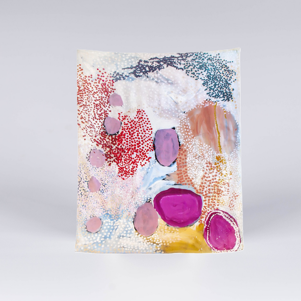 Wilarra is the word for moon in Manyjiljarra, and also the name of the site depicted in this work. A cluster of saltwater pools known for their healing properties are found at the site, and Martu people still frequent them to bathe cuts and sores. Mulyatingki Marney and her sisters often camped at Wilarra where a wungkurr (windbreak) provided shelter. Of this ethereal work, Marney says: