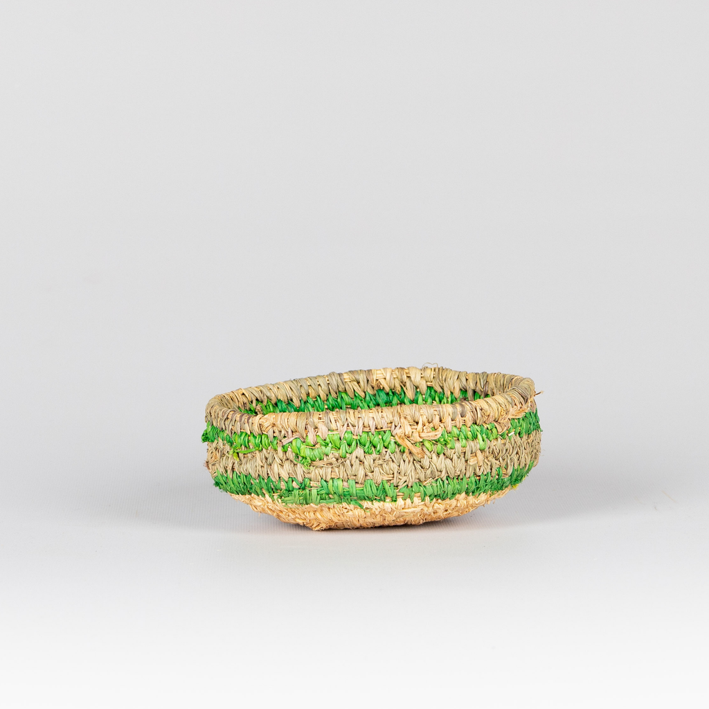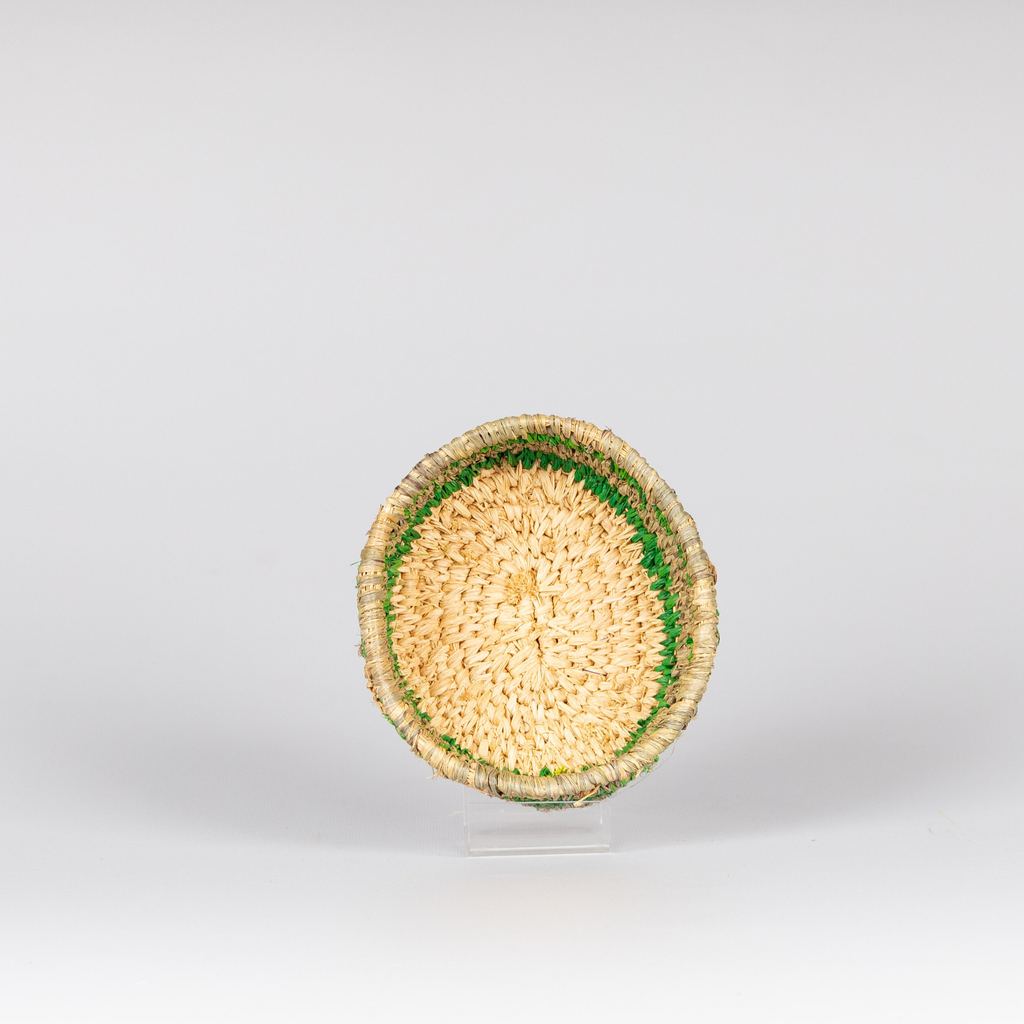 This small coiled basket was handmade by fibre artist Rene Nelson, using Tjanpi (desert grass) and raffia. Compact and full of character, it reflects the creative strength and cultural knowledge of women living on Country.
