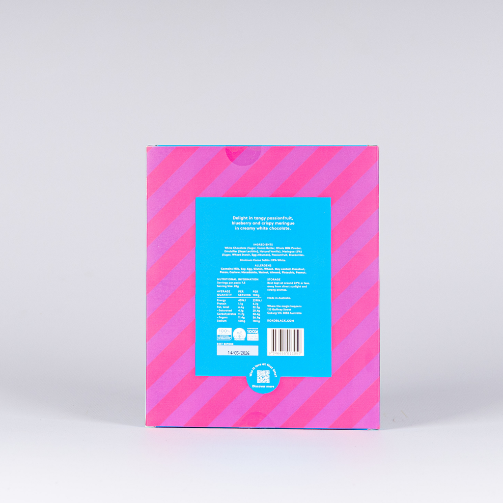 Delight in tangy passionfruit, blueberry and crispy meringue in creamy white chocolate.