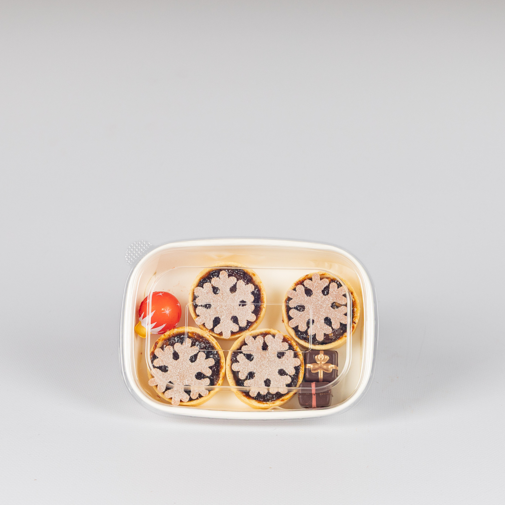 Fruit mince: mixed fruit 45%, water, sugar, vegetable oil, spices, vegetable gums (401,410), thickener (1422), acidity regulator (260), natural flavour), sultanas (sultanas, vegetable oil), currants (currants (99.5%), vegetable oil, raisin, dried cranberry sweetened (cranberries, cane sugar, sunflower oi), green cherry, sliced almond.