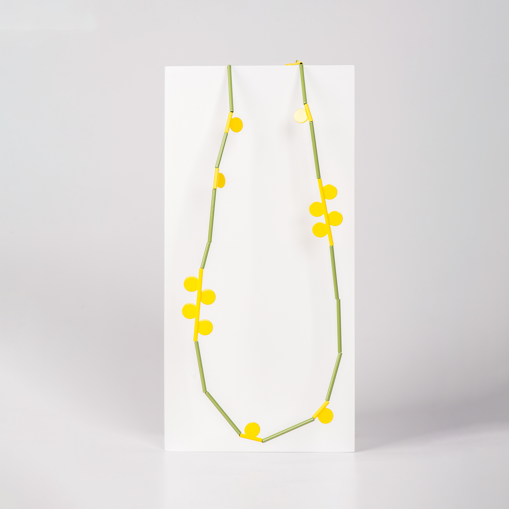 The Wattle Necklace by jeweller Jess Dare is a brightly coloured necklace inspired by forms found in nature with leaves and petals refined into geometric forms.