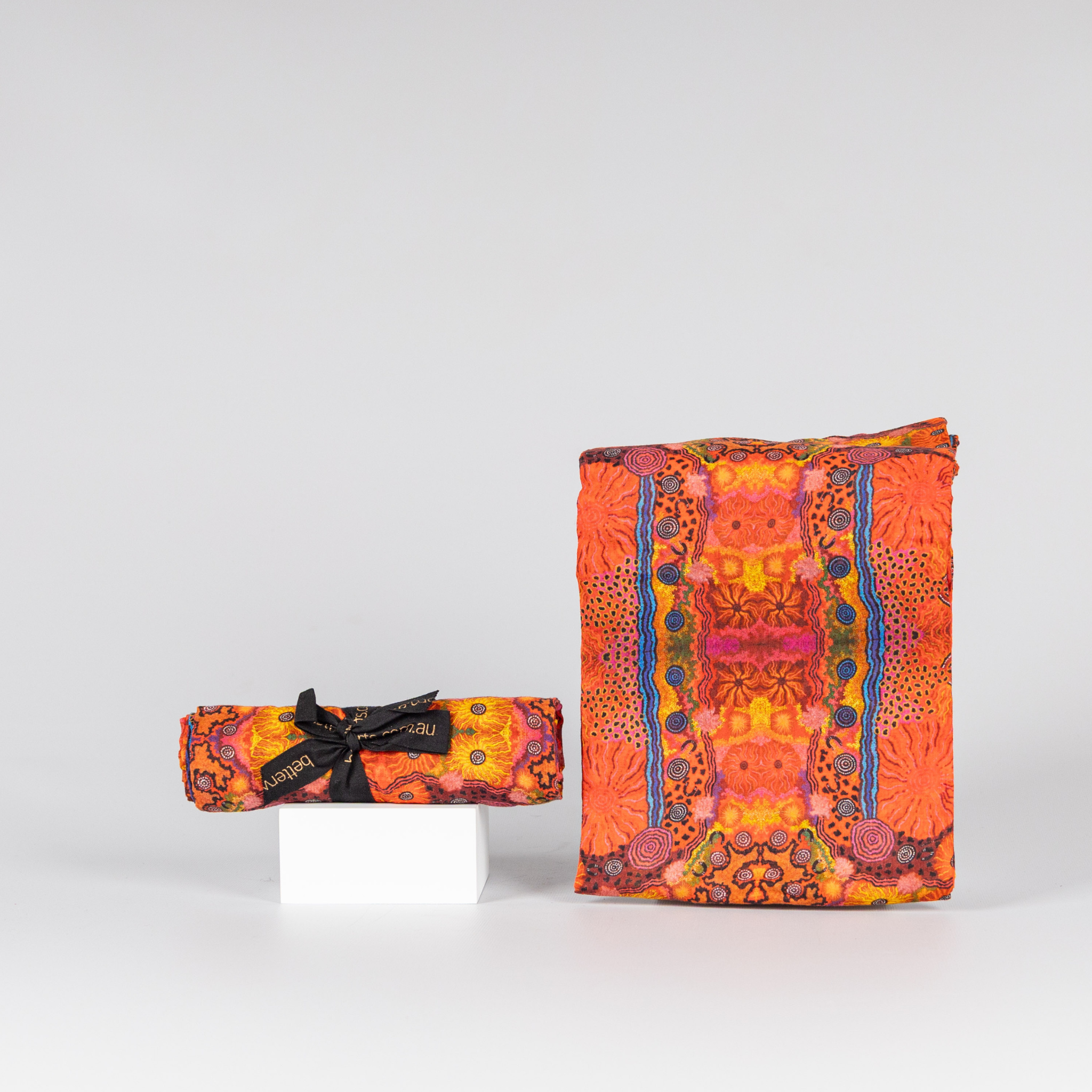Muslin Baby Swaddle featuring artworks by Murdie Nampijinpa Morris and Rama Kaltu Kaltu Sampson.