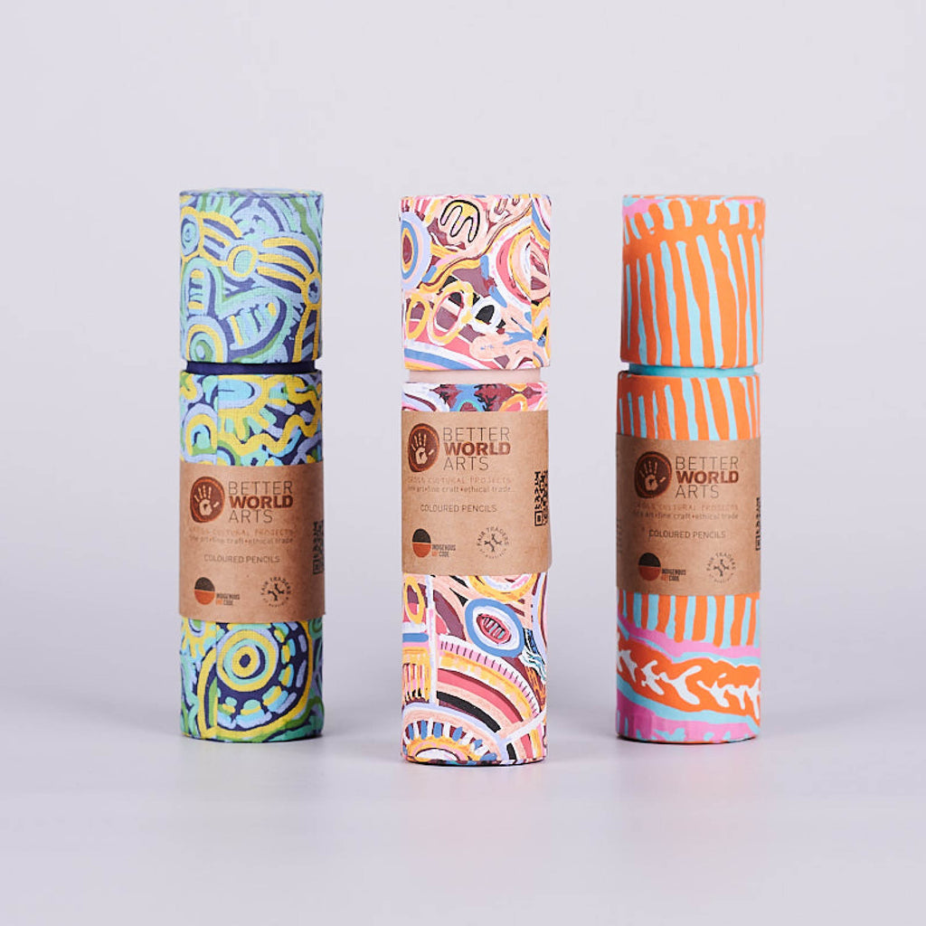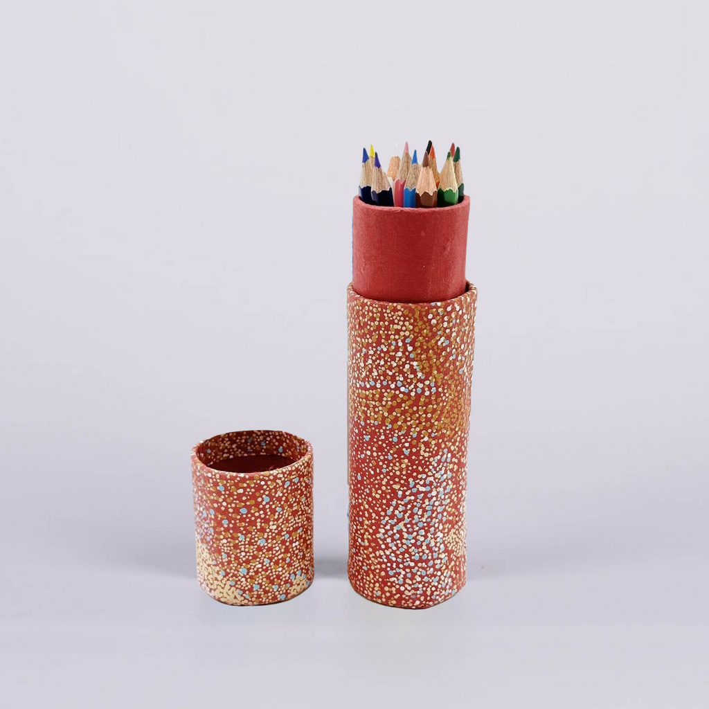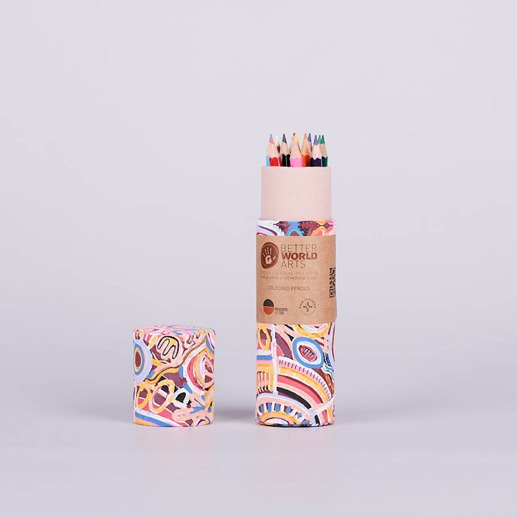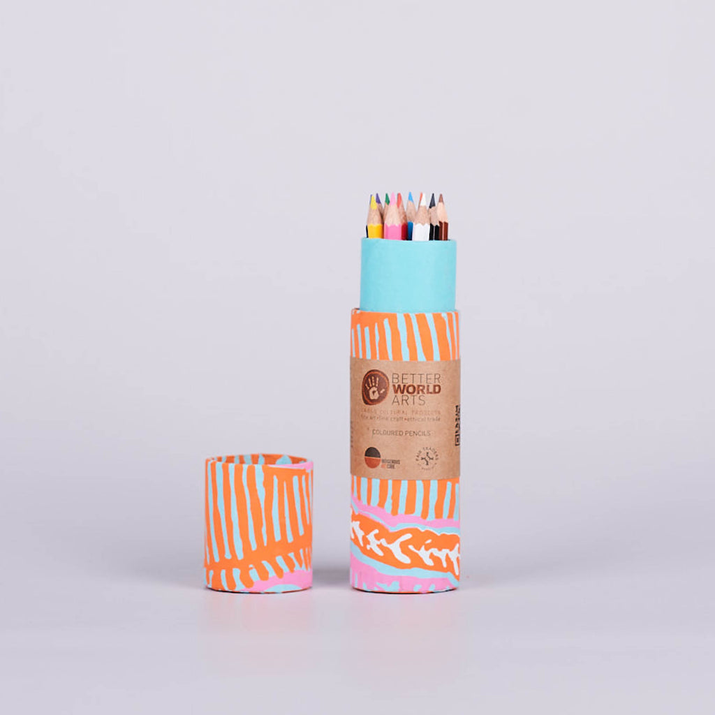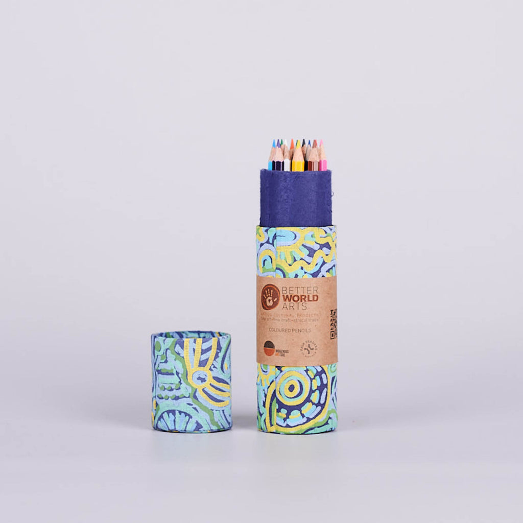 These coloured pencils come in a set of 12 quality colours. Beautifully presented in an artisanal container made from hand made paper, printed with licensed vivid aboriginal images. The paper is made from offcuts from the garment industry, repurposed and recycled for us.