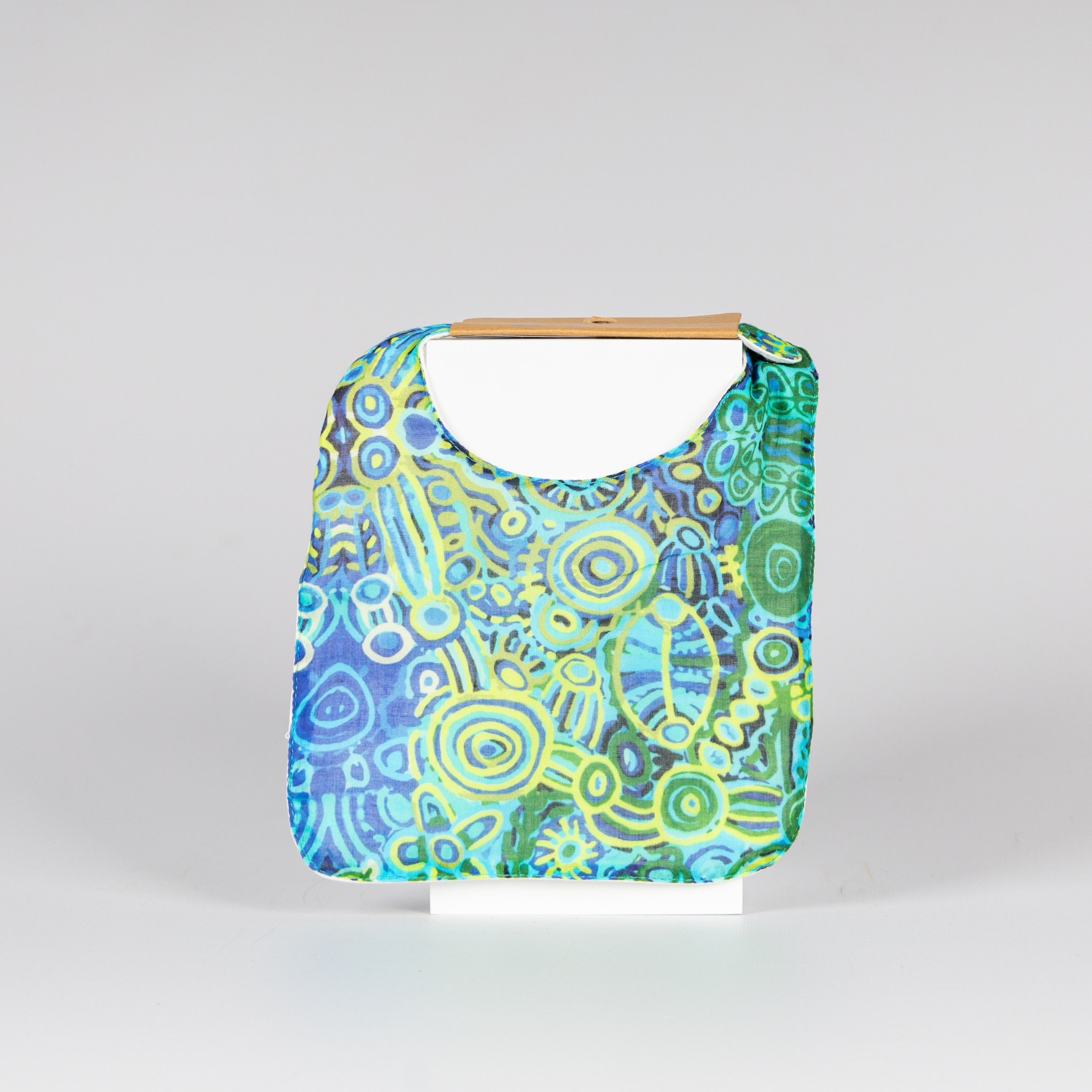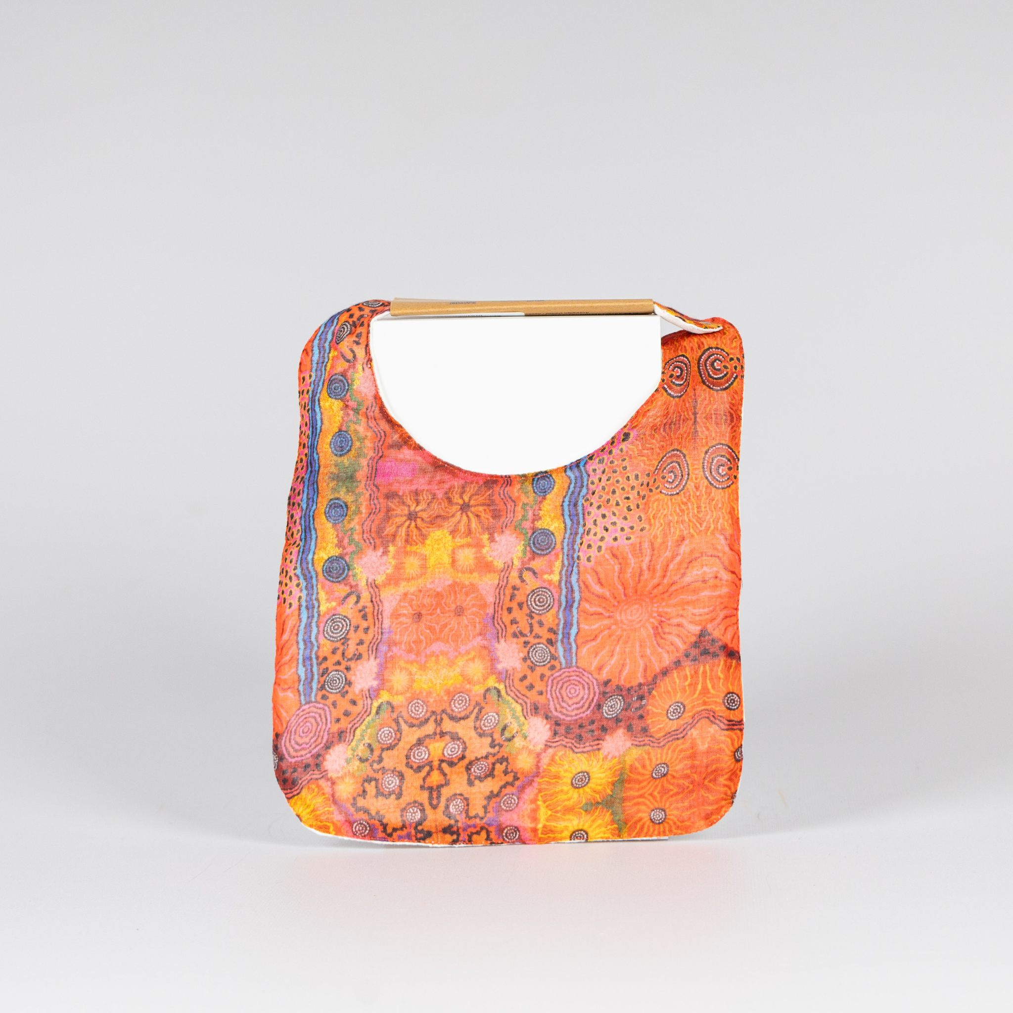 Baby bib featuring artworks by Murdie Nampijinpa Morris and Rama Kaltu Kaltu Sampson.
