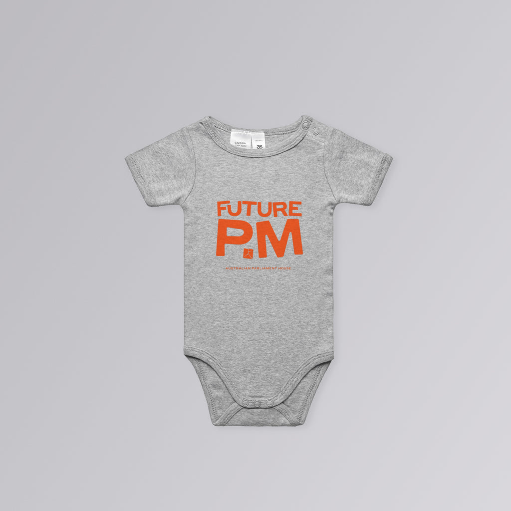 ‘Future PM’ onesie featuring a geometric design inspired by the shapes, forms and patterns that appear throughout Australian Parliament House. Can you spot the flagpole, clock and staircase?
