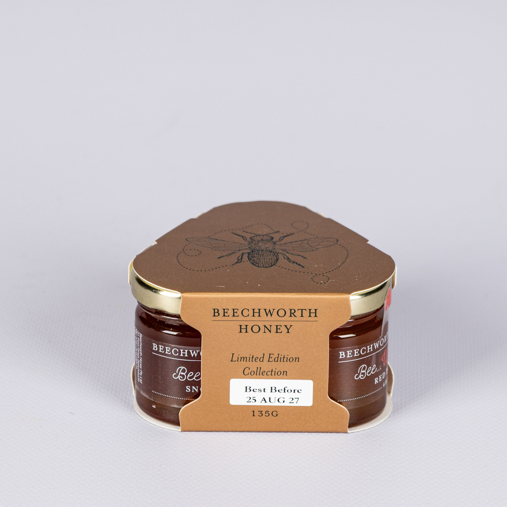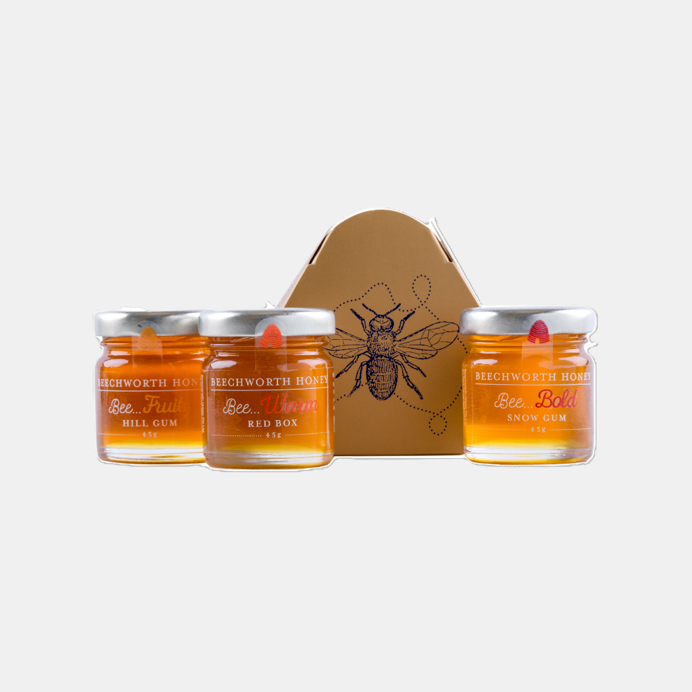 Handpicked by Chief Beekeeper Steven Goldsworthy, this gift pack showcases three exceptional single-varietal honeys – Hill Gum, Red Box and Snow Gum – chosen for their remarkable colour, flavour and character. Each 45g jar is filled with the very best of the season, offering a sweet taste of nature’s diversity.